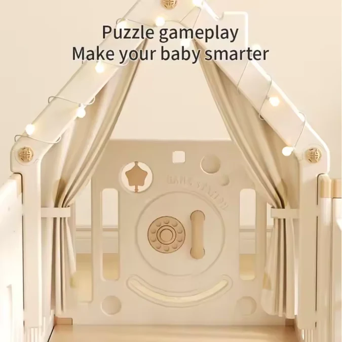 The Kids Playhouse with Toy Shelf & Playmat offers a cozy, interactive space for children aged 12 months and older. Made from durable HDPE plastic, this playhouse includes a fence set, toy shelf, and a playmat to cover the floor for added comfort and safety. Easy to assemble in about 30 minutes, it provides a fun, organized area where kids can store their toys and enjoy hours of imaginative play.